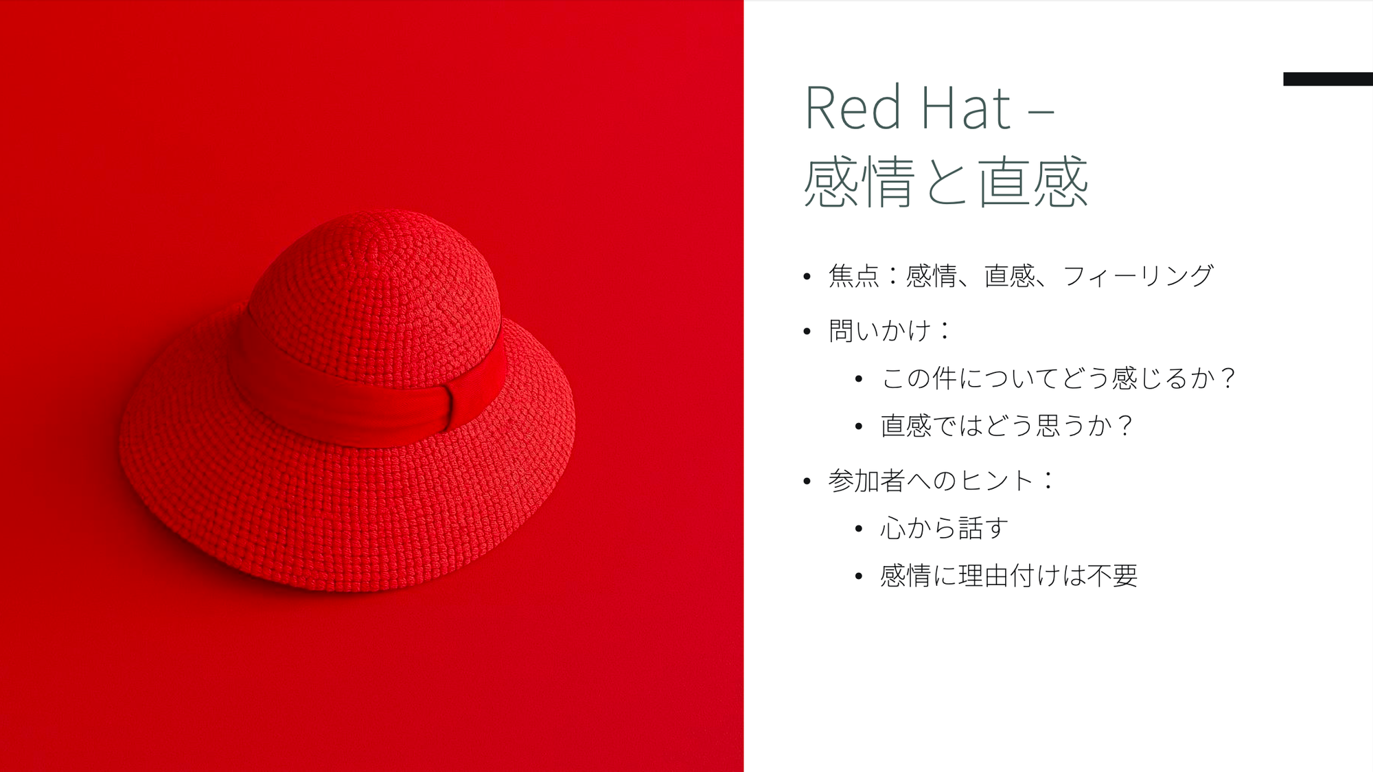- 🔴 赤い帽子(Red Hat)は感情と直感を扱います。論理的な根拠がなくても「なんとなく違和感がある」「ワクワクする」といった感覚を表現することが許されます。