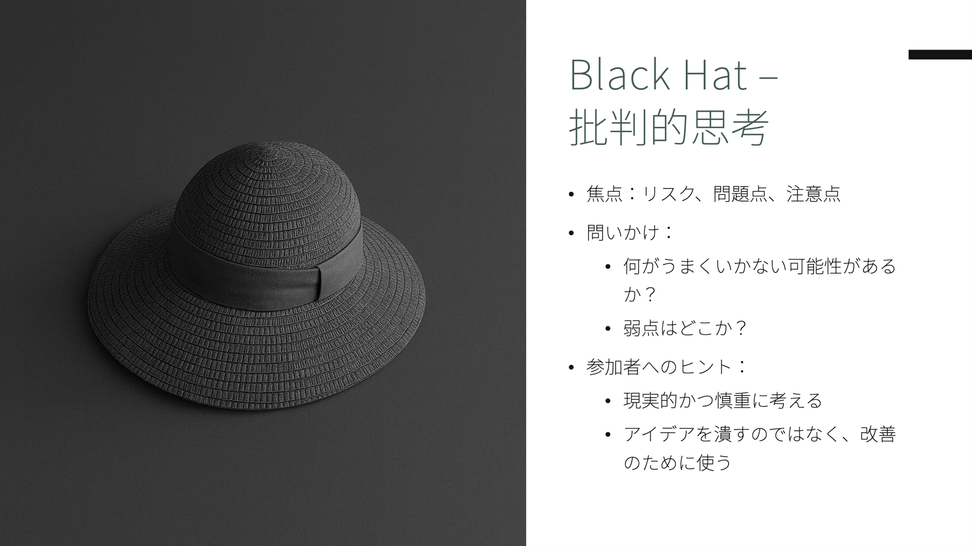- ⚫️ 黒い帽子(Black Hat)はリスクと問題点を洗い出します。批判的思考であり、「何がうまくいかない可能性があるか?」を検討します。