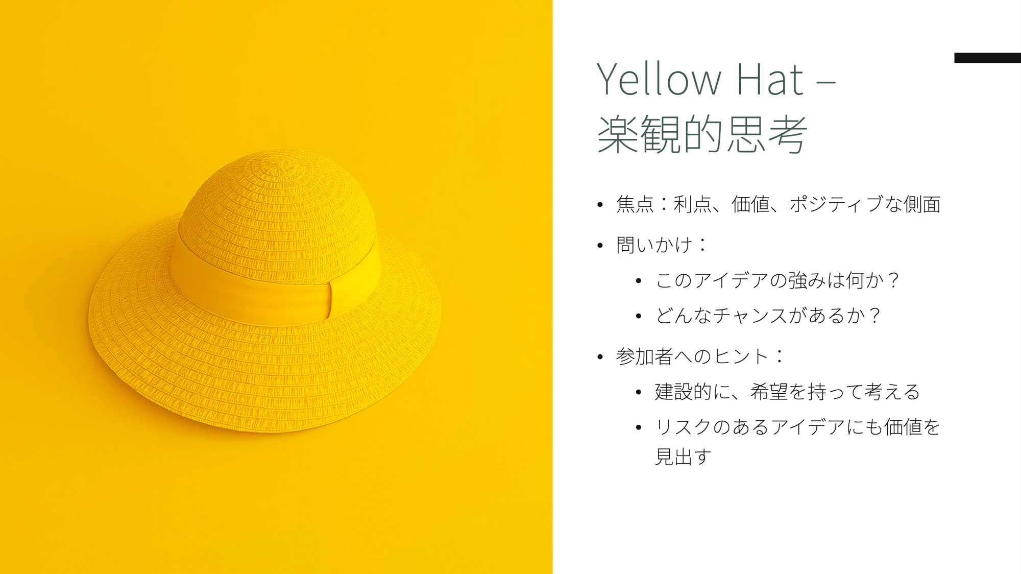 - 🟡 黄色い帽子(Yellow Hat)は価値とメリットに注目します。楽観的な視点から「なぜこれがうまくいくのか?」を探ります。