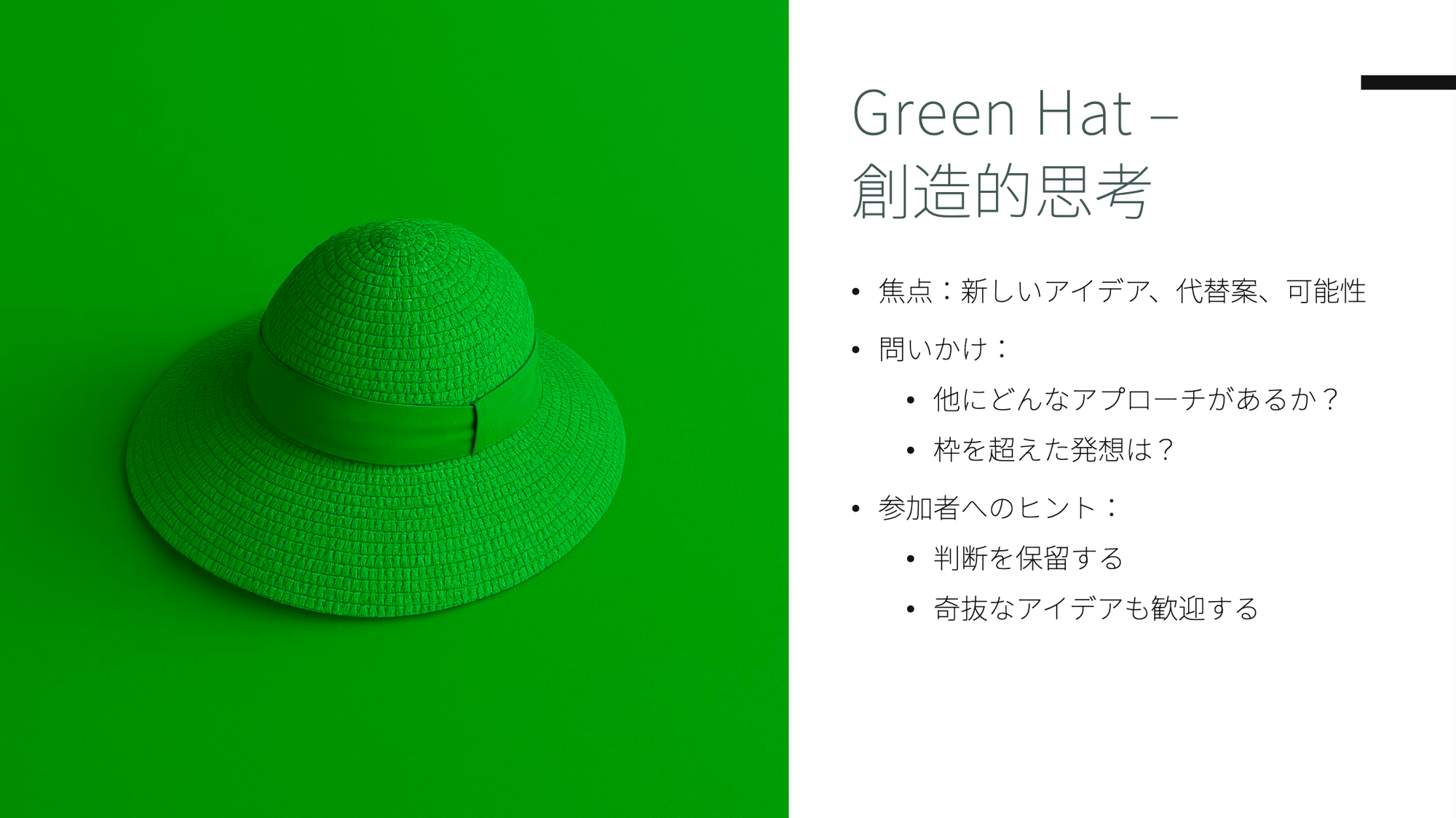 - 🟢 緑の帽子(Green Hat)は創造性と新しいアイデアを生み出します。既存の枠にとらわれず、「他にどんな可能性があるか?」を問います。