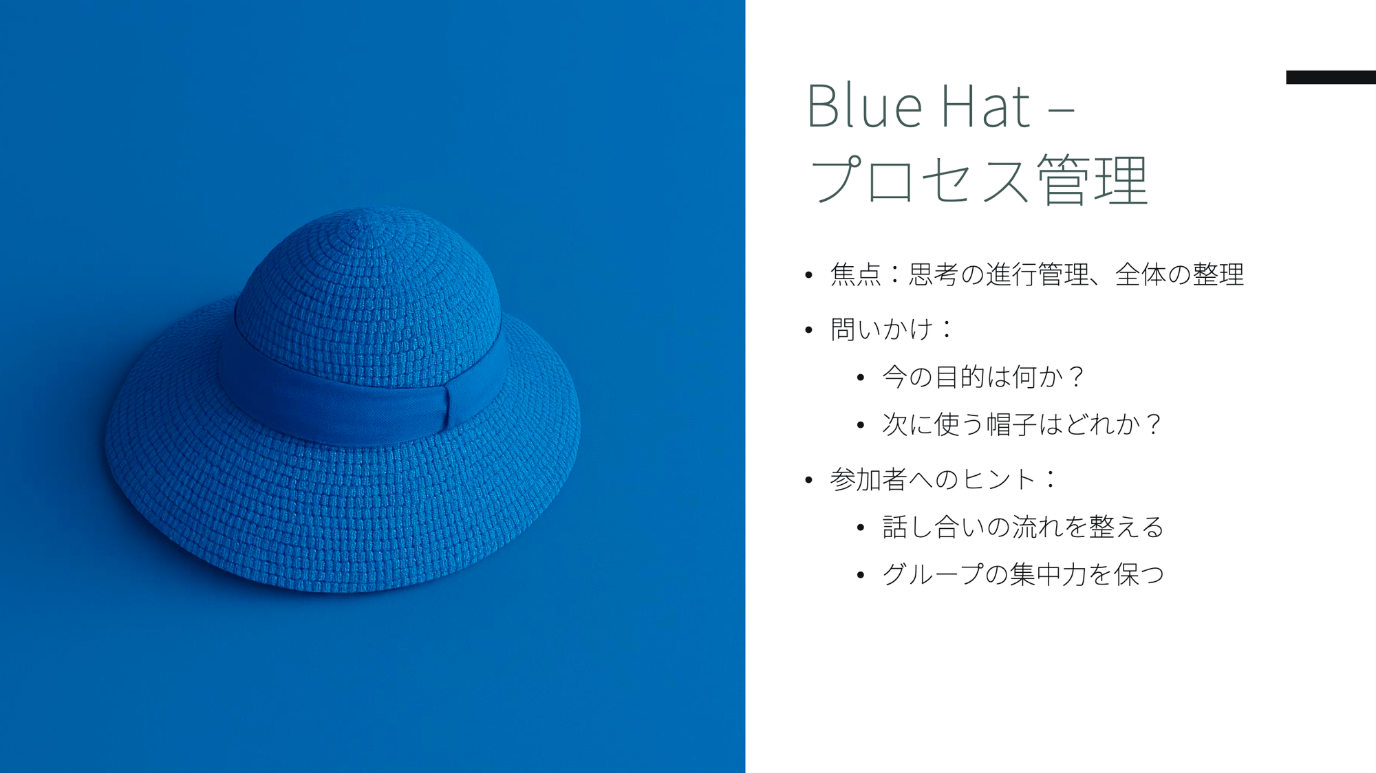 - 🔵 青い帽子(Blue Hat)はプロセス全体を管理します。メタ的な視点から「今どの帽子を使うべきか?」「議論は目的に向かっているか?」を俯瞰します。