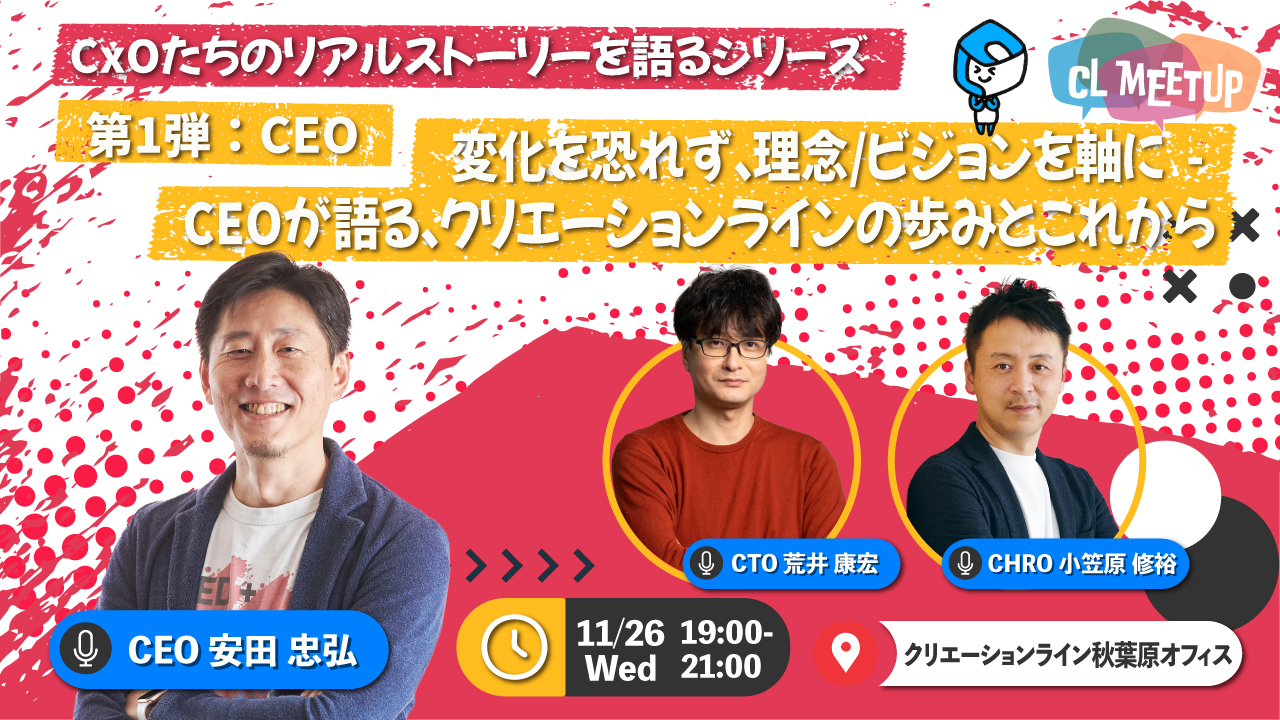 # 【CEO✕CTO✕CHROが共同運営する対面イベント】CxOたちのリアルストーリーを語るシリーズ in 東京 第1回 CEO安田編 CL Meet Upで、CxOたちのリアルストーリーを語るシリーズを開始します。 対面イベントとして、まずは東京で開催。来年以降は各都市での開催も予定しています。 記念すべき第1回のゲストは、CEOの安田さん 2006年の創業以来、クリエーションラインは変化の波の中で進化を重ねてきました。 経営者としての安田さんの歩みには、いくつもの転機と決断、そして理念、ビジョンへの原点回帰がありました。 2012年に訪れた最初の危機、そして…