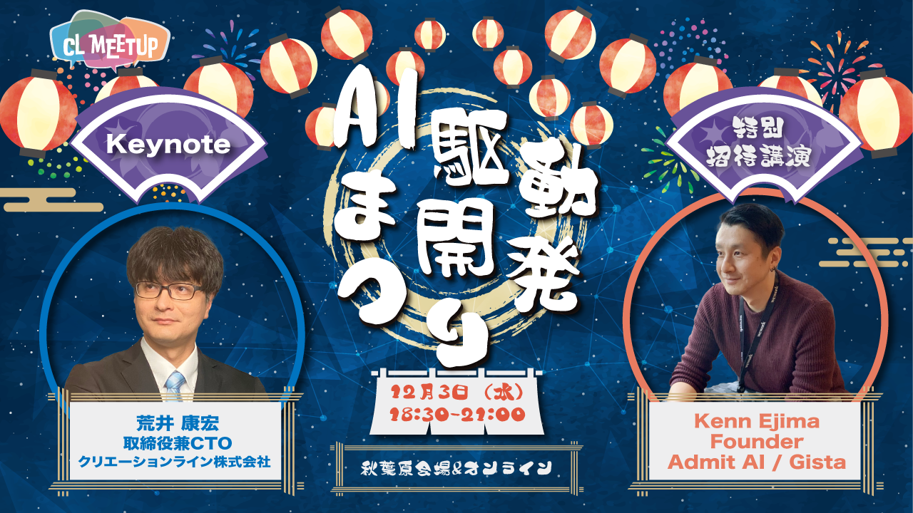 # 【AI駆動開発まつり】AI駆動開発の現場テクニックを徹底紹介!!(Kenn Ejimaさん招待講演) ### AI駆動開発勉強会やAI駆動開発カンファレンスに参加&協賛してきたクリエーションライン(株)が、自分たちが開発現場で実践してきているAI駆動開発を一気に語る『AI駆動開発まつり』を12月3日(水)に開催します!! ### 今回はスペシャルゲストとして、Kenn Ejimaさんを招待講演でお招きします!! AIを使ったソフトウェア開発にご興味のある方、既にやってはいるけど苦労している方には必見です!! > 招待講演『失敗しないAI駆動フルスタック開発』をお話し頂くKe…