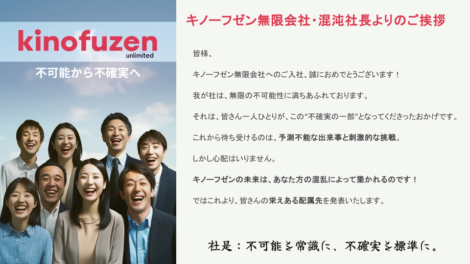 09:30 – 10:00 | 入社式・配属先発表 | 役割カードと状況設定で、参加者を「キノーフゼン無限会社」の世界へ |